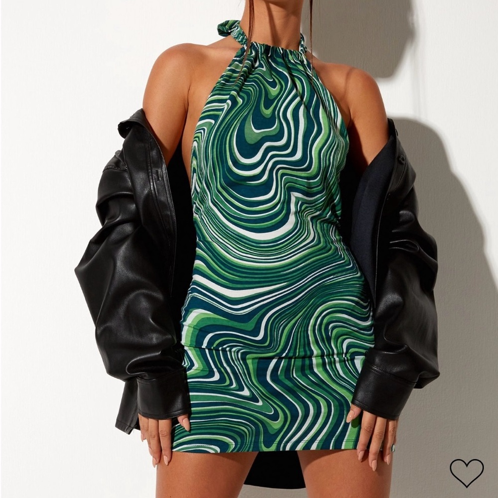 Stand out with this vibrant swirl mini dress. Features a halter neckline. Perfect for any occasion.