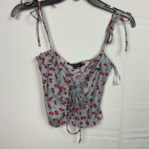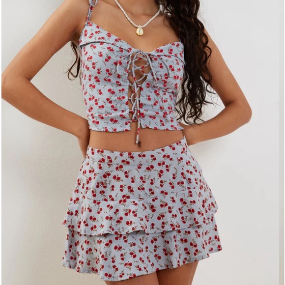 Embrace a playful look with this floral print ruffle skirt. Comes with the matching lace up top.