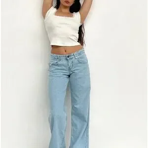 Chic light blue flare jeans. Perfect for casual wear. Flattering wide-leg design.