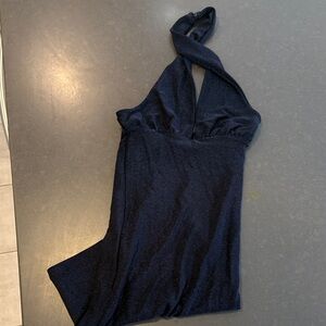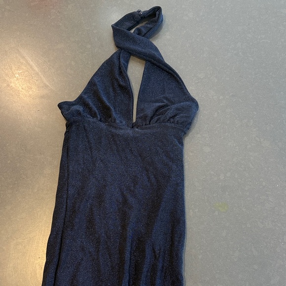 Elegant navy halter dress. Perfect for evening wear. Soft and stylish.