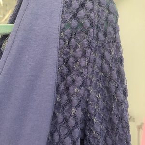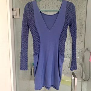“Beautiful periwinkle dress with geometric sheer seersucker sleeves, low exposed mesh back and slimming cut-out mesh panels at the waist. With curve hugging stretch cotton, flattering long sleeves, mini dress length and peek-a-boo panelling.”