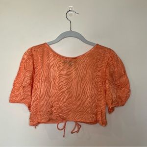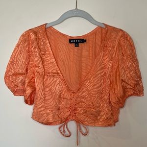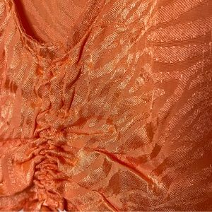 Zebra print satin top in the color cantaloupe. Features puff sleeves, deep v neckline, grunt ruched detailing, and a satin finish. Looks so cute with jeans!