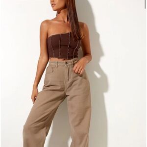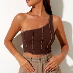 Work some brown hues into your wardrobe with our Rara top. Featuring a cropped fit and one shoulder design in a deep mahogany with brown stitching.