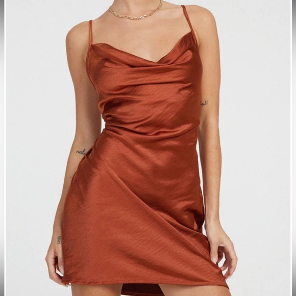 Chic rust satin mini dress. Features a cowl neckline. Perfect for a night out.