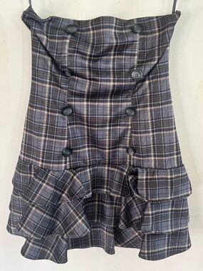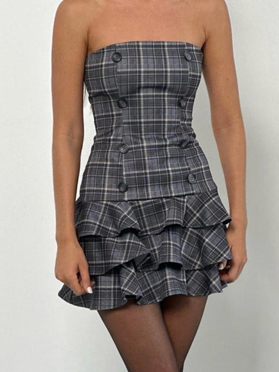 Strapless plaid mini with a fitted bodice. Double-breasted button accents on front. Layered ruffle skirt adds movement. Sleek, tailored silhouette for day or night.