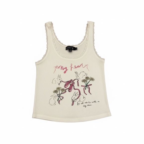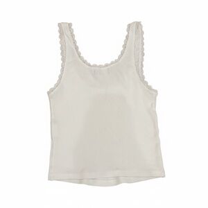 Soft cream ribbed tank with delicate lace trim. Sleek sleeveless design. Minimal, feminine look.