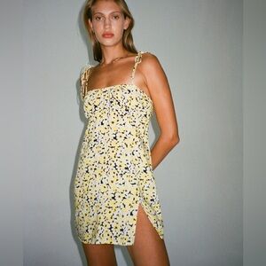 Motel Rocks Chic yellow dress with a floral pattern. Features spaghetti straps for a stylish look.