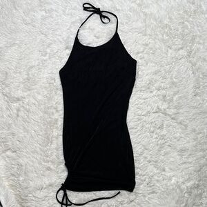 Chic black mini dress. Halter neck design. Perfect for any occasion.