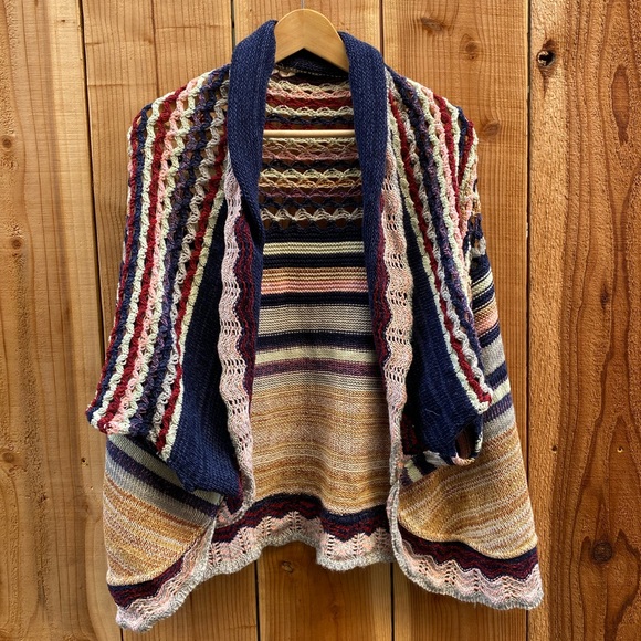 Very cool and unique, size is large and fits well on size medium. 75%cotton 20% polyester 5% acrylic
