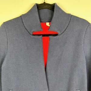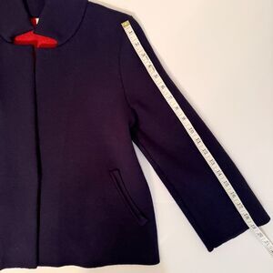 Moth Anthropologie Amoruso Two Toned Knit Cardigan Sweater Jacket in Navy Blue with Red Lining. This knit sweater style blazer jacket has a notch collar and single front snap button closure. Slightly cropped sleeves that look great rolled up to reveal the vibrant red interior shade! Perfect for a tailored preppy academia look. Excellent used condition. Women's size XS extra small, measurements pictured.