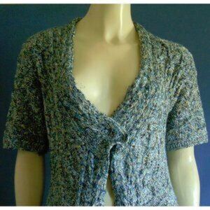 Moth green multi short sleeve cardigan from Anthropologie in a size medium. Cables. Large snap & small clasp closure. 60% cotton, 29% acrylic & 11% nylon. Hand washable. Comes from a smoke free home. In excellent condition.