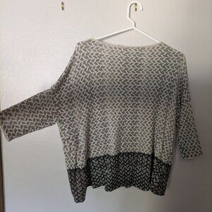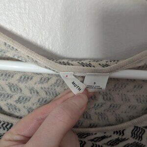 Moth at Anthropologie Wool-Blend Sweater. Sleeves are elbow-length. Front comes to a criss-cross and is a bit cropped but works with high-waisted pants or skirt. Fun orange beading on the black portion of the sweater.