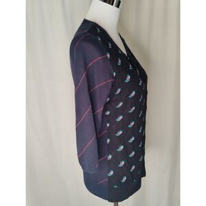 Moth Anthropologie cardigan pinstripe fox foxes pattern vest navy red black retro in fair pre-owned condition with no holes, no stains, and considerable pilling.