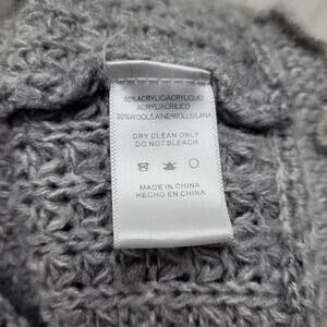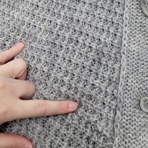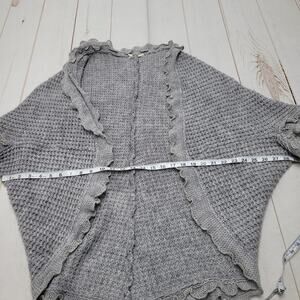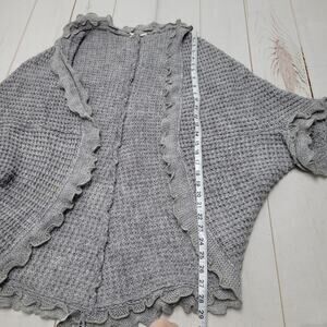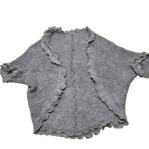 Really cute Anthropologie Moth cocoon cardigan! Looser gray knit with lots of ruffle detailing in a wool blend. Sweater is in sturdy condition but has two faint stains on the front (Last pic). Size small