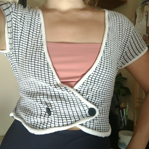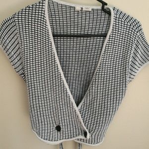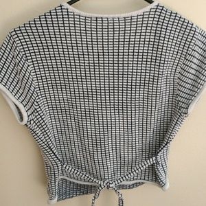 Blue and white sweater material crop top. Two dark blue buttons in the front, tie that can tie in front or back. No stains or tears, smoke free home.