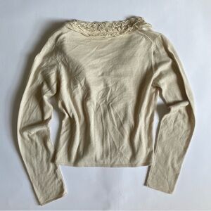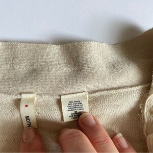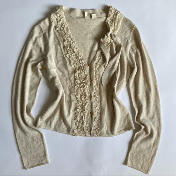 Moth beigh ruffle cardigan button up with tie detailing 50 wool 50 cotton size med for fitted look, cute on a small ptp;17 length;22.5 #anthropologie #wool #luxury #y2k #moth