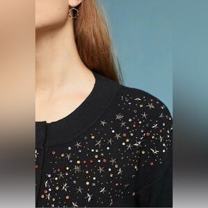 Elevate your wardrobe with this stunning Moth Anthropologie cardigan sweater. The tight-knit polyester and rayon material offers comfort and durability, making it suitable for travel, casual outings, workwear, and business occasions. The black sweater features a round neckline, long sleeves, and snap closure with beaded stars and rhinestones accents, adding a touch of bohemian vibe to your outfit.