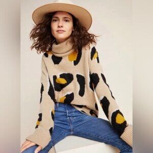 Anthropologie Moth Georgia Animal Print Sweater Turtleneck Black/Tan Leopard Oversized Cozy L