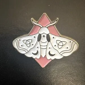 Brand new white moth pin with pink diamond background approx 1”