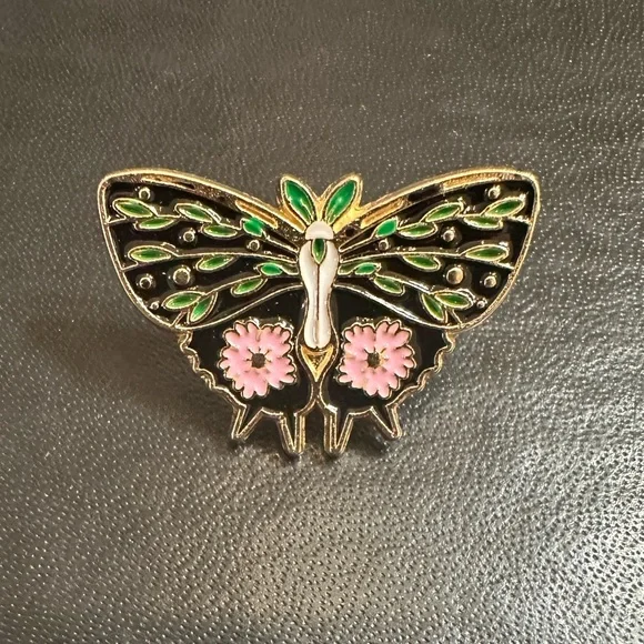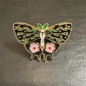 Brand new pink green black gold floral and botanical moth pin approx 1”
