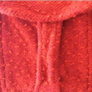 Very comfortable, textured reddish-orange skirt with 2 front pockets. It’s approximately 18.5” long. In fairly good used condition with pilling throughout.