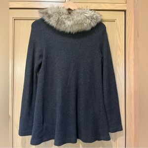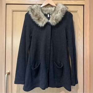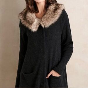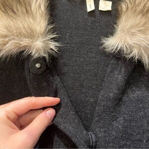 Anthropologie heathered slate sweater coat by Moth Faux fur collar is removable. Two front pockets. Extra button attached (see pic)