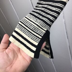 Moth (Anthropologie) Black Cream Stripe Bell Sleeve Top. Size Medium. This is a fitted tunic style sweater with a black stripe down right & left side. Cream and black horizontal stripes throughout sweater. Sleeves are wider at the bottom have a slight bell or trumpet look. Appears to never have been worn! No flaws. 62% rayon, 38% nylon.