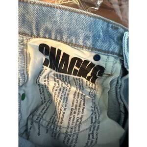 A high-rise tapered jeans with a button fly, busted knee, ankle length in Lots of Nibbles