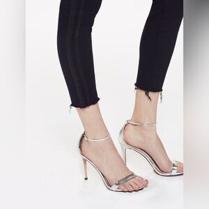 Cropped skinnies that feature a sparkle racer stripe down the sides and a fraying hem. The high rise cinches at the waist while the comfortable stretch hugs curves