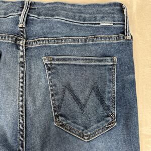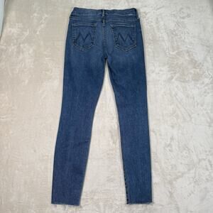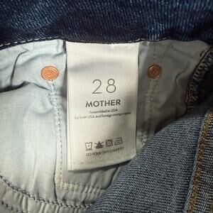 The Mother Denim The Looker Ankle Fray Jeans in the Need For Speed wash, size 28, are a stylish and versatile addition to any woman's wardrobe. These skinny and slim-fit jeans feature a mid-rise waist and a 29-inch inseam, with a 5-pocket design and a zipper and button closure. Made from a comfortable and stretchy denim fabric blend with spandex, these jeans are adorned with subtle logo accents and a dark blue wash. Perfect for all seasons, these designer jeans capture a trendy and chic look with a touch of bohemian flair.