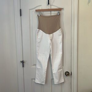 Adorable white denim Pony cropped slim straight jeans in the color "Stayin' Alive". In excellent condition. Full maternity band. Size 29, which is an 8 in US sizing.