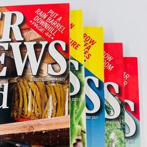 "Mother Earth News 2021 magazines, covering sustainable living, homesteading, off-grid living, gardening, and farming. Includes issues from December 2020 to September 2021. Preowned with light wear around the edges, and three copies have the address marked out on the cover. Perfect for eco-conscious readers and those interested in self-sufficient lifestyles."