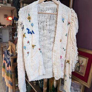 Chunky, knit cardigan with drop shoulders, patch pockets, fringe, and embroidered flowers and skulls on the front.
