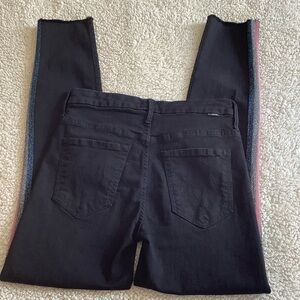 Mother black high waisted Looker ankle fray Guilty Glitter Racer skinny jeans. Racer side stripes in blue, pink, silver and black glitter. In excellent worn condition. Approximate measurements laying flat: waist 26”, inseam 27” and rise 8.5”. No holes or stains.