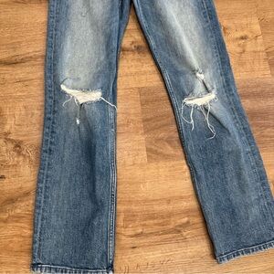 Out of this world. The pertect high-waisted straight leg with an ankle-length inseam and a clean hem. Crafted from SUPERIOR denim in a medium blue wash with holes at the knees.