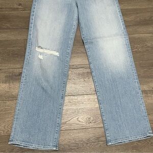 Super high-waisted jeans with a loose fit, slightly dropped crotch and a wide leg. Made from denim with a touch of stretch, Sippin' Sweet Tea is a light blue wash with subtle whiskering, fading and distressed details throughout.