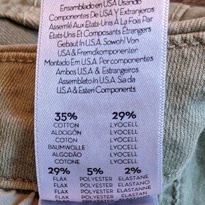 These are Mother Looker jeans in the faded green color Trespassing. They are in good pre-owned condition, with a few faint subtle stains or discolorations just below the zipper on the front (see the third image for a close-up). They are a size 28, and the last two images show measurements. High-rise, raw frayed hems, zip fly with button closure, 5-pocket style, skinny leg. Stretchy soft denim fabric made of 35% cotton, 29% lyocell, 29% flax, 5% polyester, and 2% elastane.