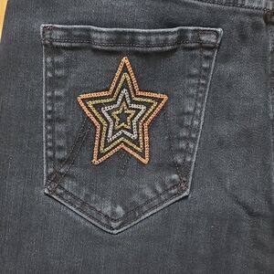 Mother High Waisted Looker jeans. Blackbird (black) wash. Skinny ankle length jeans with an embroidered star on the back pocket. They have some snags and puckering. They are stretchy.