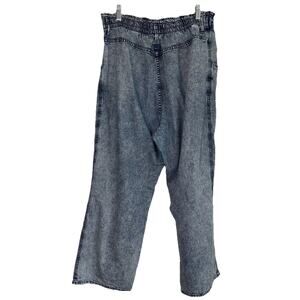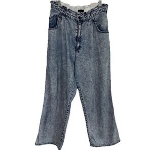 Baggy acid wash lightweight jeans. Light wash. Stretchy ruffle waist. Wide ankle. Flowy. Comfort. Soft material. Casual. Designer. Fall. Outdoors. Festival. Party.