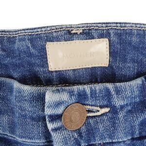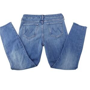 The product is a pair of Mother Jeans for women in size 29. The jeans feature a high-waisted, ankle-length fit with a frayed hem, made from a stretch denim fabric that combines polyester, polyester blend, and cotton blend. They have a classic zip and button closure, a 5-pocket design, and come in a solid blue color. The brand, Mother, is known for its effortless chic and minimalist style, with a focus on quality and comfort. These jeans are designed for all seasons and can be machine washed for easy care.
