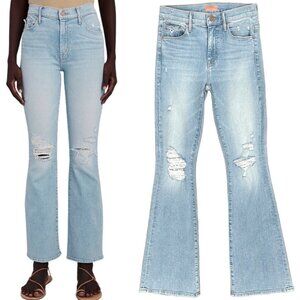 Mother Mid-Rise The Weekender Distressed Flare Jeans in Free Hugs Light Wash