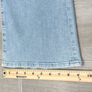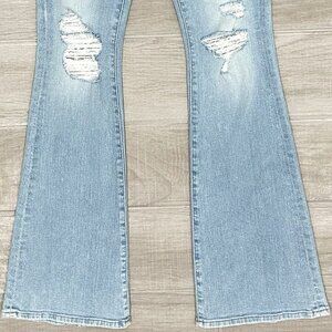 “Flared for a leg-lengthening silhouette, MOTHER's The Weekender jeans are distressed in their Free Hugs light wash denim.