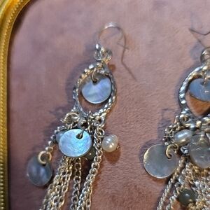 Add a touch of elegance with these stunning silver dangle earrings. Genuine pearl beads and mother of pearl discs. Perfect for any occasion.