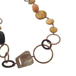 This stunning Mother Of Pearl Shell Glass Beaded Women's Necklace by Handmade is a perfect accessory. It's brown and gold, 30 inches long, with a geometric pattern made from shell, metal, glass, and acrylic.