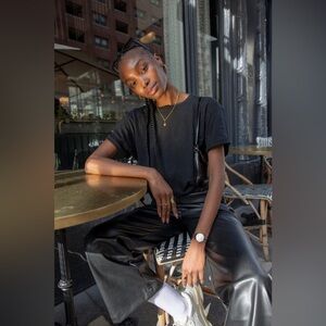 Faux real. These slick wide-leg pants have a comfortable fit with a high rise, elastic waistband and ankle-length hem. Cut from a buttery soft faux leather fabric in a midnight black hue. Made in Los Angeles. Style No. 1388W-1017-WXO MOTHER The Skippety Ankle Wax On, Wax Off Pants new with out tags