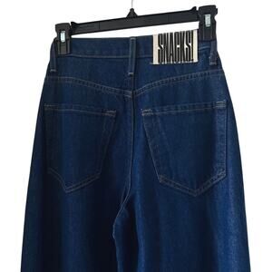 A wide barrel-leg jean from SNACKS. a collection of unconstrained silhouettes leaning into exaggerated shapes and extreme proportions. Experimental and non-era specific. For everyone, or nots. The super high-rise jeans are designed with loose fit and a tapered leg with a long Top inch inseam that stacks at the ankle. Made from a recycle..