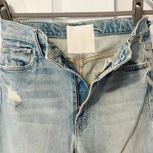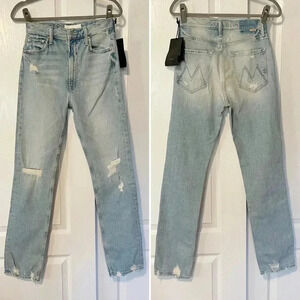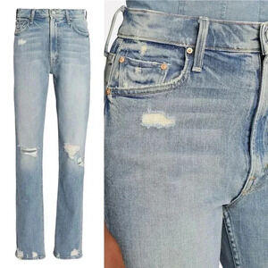 MOTHER cuts a new straight-leg fit with their The High-Waisted Rider Skimp jeans in their Confession wash. Belt loops. Zip fly and button closure. Five pocket styling.