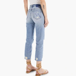 The most loved MOTHER superior style! The MOTHER Superior capsule launched in 2017 using men’s jeans, patterns and fabrics for a "borrowed from the boys" look. High rise, button fly jean in a relaxed fit, vintage-inspired wash and distressing. Holier Than Thou patch included.