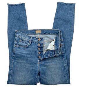 This MOTHER women's The Fly Cut Stunner Ankle Fray Jean Final Frontier a statement due to it's skinny leg, higher rise, distressed exposed button fly, pockets, belt loops and medium blue washed denim.