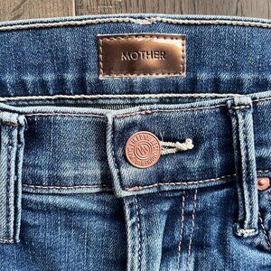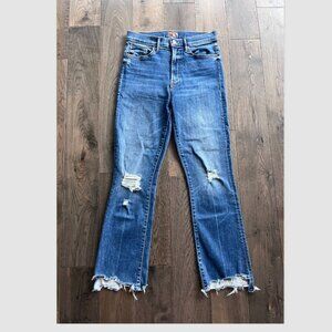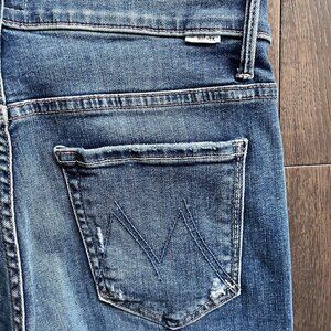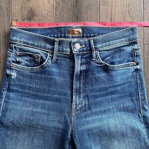 Keywords: Mother jeans, high rise cropped denim, raw hem jeans, distressed hem, step hem, dancing on coals wash, premium denim size 27, edgy denim style, trending jeans